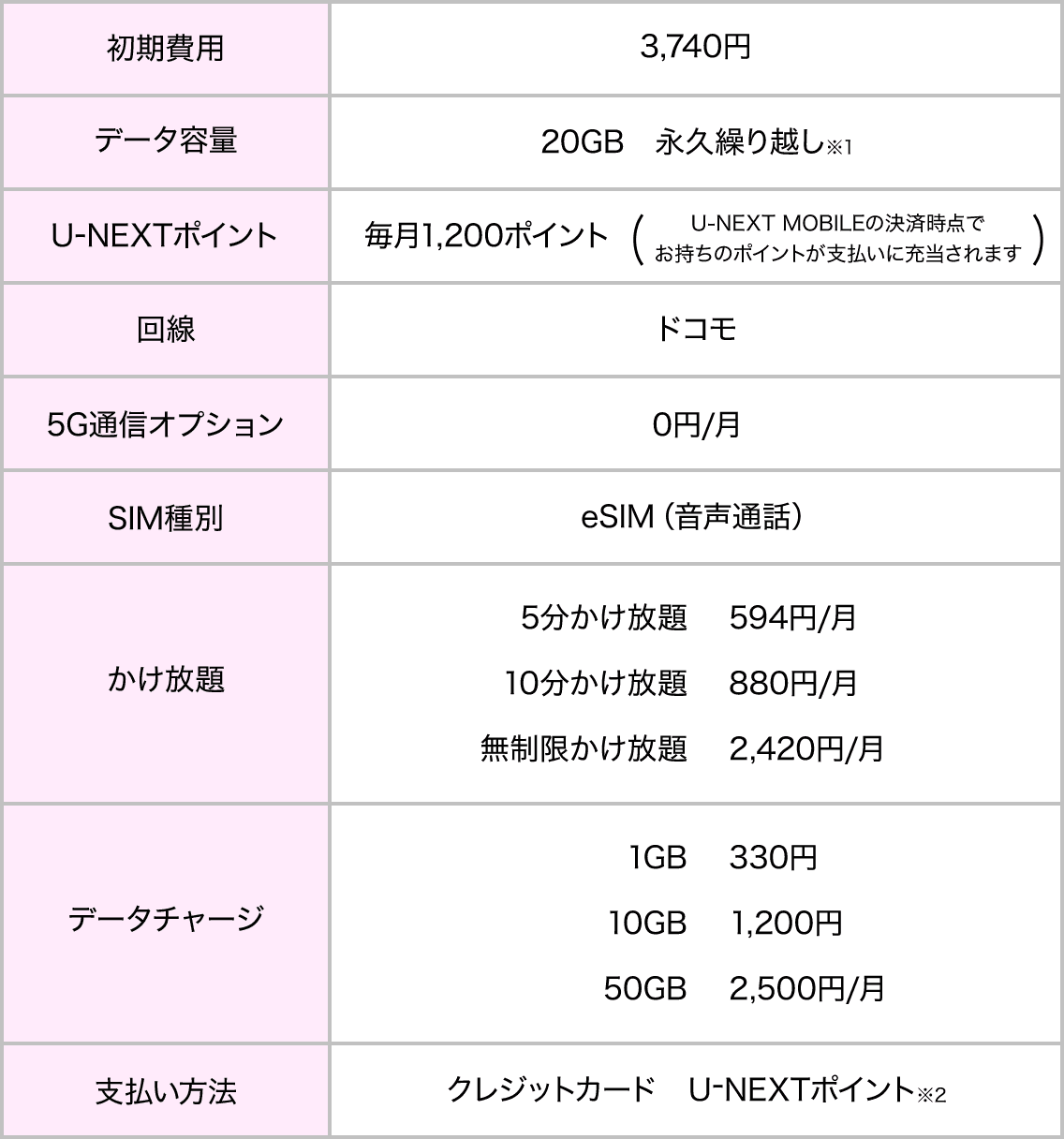 U-NEXTポイントは、U-NEXT MOBILEの初期費用 / 月額基本料 / データチャージの支払いに利用できます※。ただし、通話料 / SMS通信料 / オプションなどの月額利用料には使用できません。
