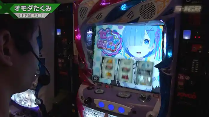 「Re:ゼロから始める異世界生活」1回戦をトップで勝ち抜いてきた戸田マサシン、オモダたくみ、そしてマッスル峠の3人。実戦する機種はRe:ゼロから始める異世界生活、ゴーゴージャグラー2などだ。