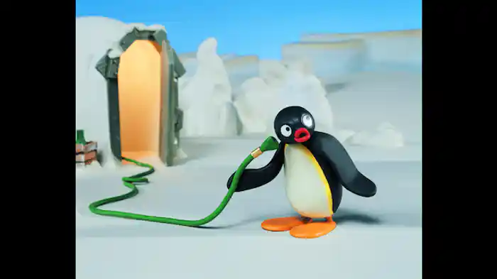 じょうごのついたホースを手に入れたピングーは、拡声器のように使えることに気がついた。ホースの一方を雪だるまの口元につけて、ピンガを驚かせたり、いろんないたずらを思いつく(「ピングーとホース」)。