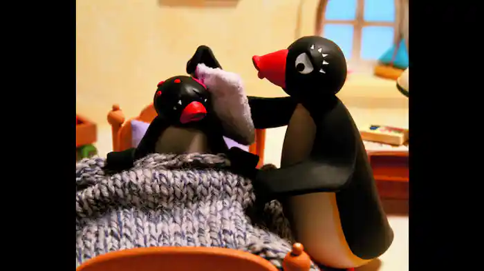 朝、ピングーの隣のベッドで寝ているピンガは苦しそうにしていた。体は赤い湿疹だらけ。パパとママがピンガにかかりっきりで看病しているので、ピングーは少しうらやましくなる(「かわいそうなピングー」)。