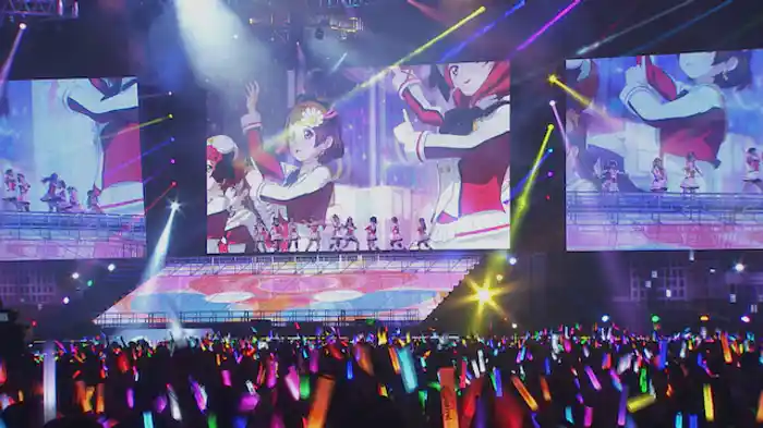 高坂穂乃果役の新田恵海、絢瀬絵里役の南條愛乃、南ことり役の内田彩らアニメーションのダンスPVを演じるキャスト陣によって再現された華やかなステージは圧巻。