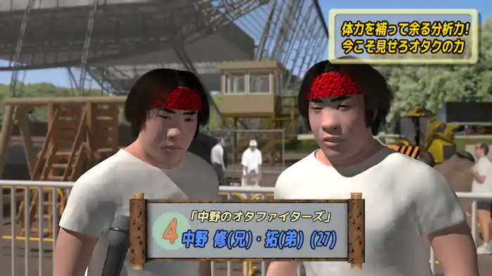 忍者のスタイルをしたアメリカ人の双子・ヴィクター兄弟は、おかしな動きでアトラクションに挑戦する。カツオ漁師の喜矢兄弟は、スタート地点で村に伝わる勝利の儀式を行うが、気合を入れ過ぎてしまったため…。