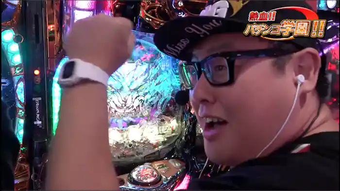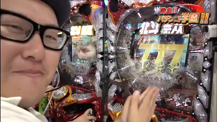 伊達レンと石川典行がホールで実戦するのは「ぱちんこCR真・北斗無双」。打ち始めから熱いリーチに遭遇する石川だが、あと一歩のところで外れてしまう。一方、先生こと伊達は、となりで解説をしながら実戦し、見事に激闘ボーナスをゲットする。