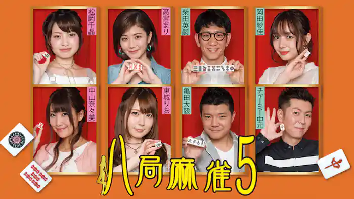 麻雀好きタレント4名と、それを迎え撃つ美人女流雀士4名によって開催された「八局麻雀5」。決勝2回戦も亀田大毅、岡田紗佳、チャーミー中元、東城りおが卓を囲む。柴田英嗣、高宮まりなどが解説を務める。
