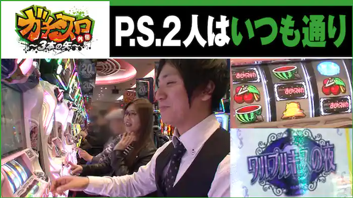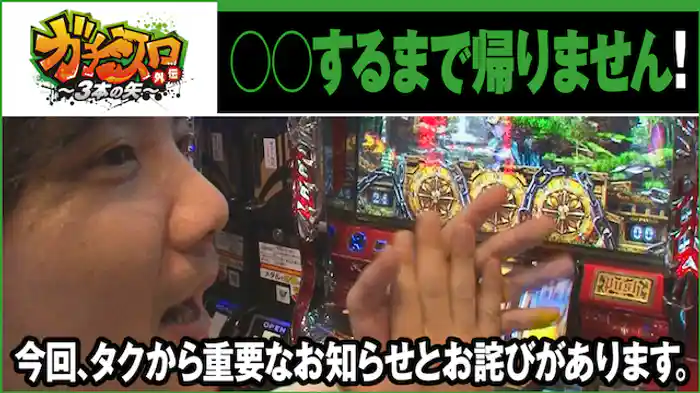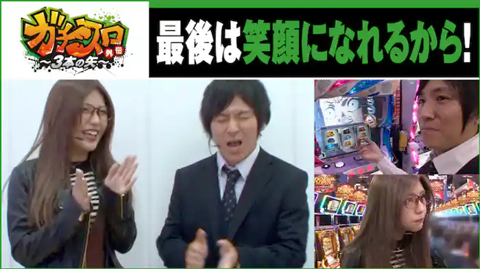 「パチスロ化物語」実戦ホールは奈良県の「アロー天理店」。タク、七瀬コンビの2戦目だが、オープニング早々、過酷な罰ゲームを懸けた大喜利対決が始まる。実戦する機種はパチスロ化物語などだ。