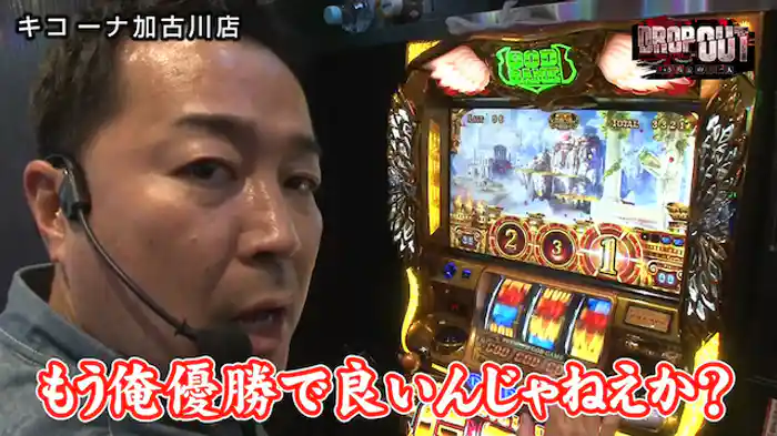 第1回目は、ウシオ、ジロウ、セイジ、諸ゲンの4人でスタート。諸ゲンだけがなかなか当たりに恵まれず、挙動の良かった隣の台に移動した。そして、一人また一人と脱落していく。また、回を重ねるごとに、次々と凄腕スロッターが登場する。