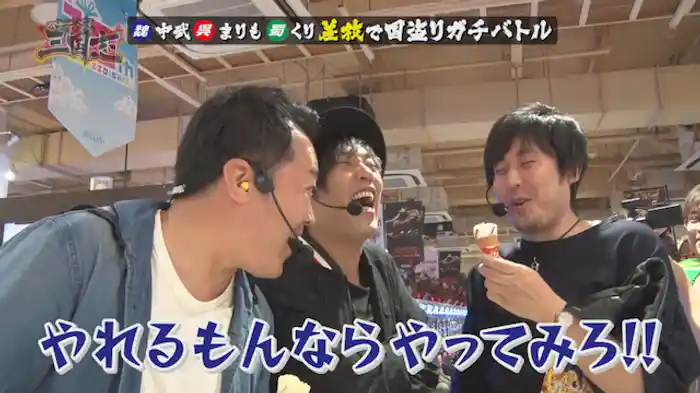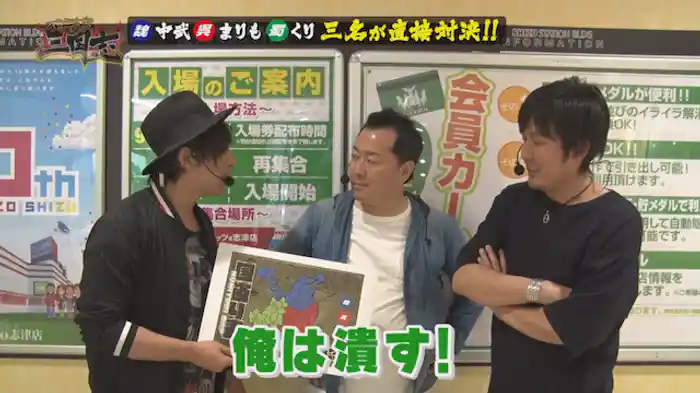 「CR RAIZINMAN」まずは3人並んでの実戦。しかもパチンコだ。勝負機種は、ライジンマン。まりもは今回が初打ちで、興奮状態となる。誰が最初に大当たりをゲットするのか、そして国取りはどうなるのか、注目される。