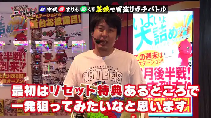 「バーサス」今回は、中武一日二膳、まりも、くりが並んでバーサスを実戦する。今回のミッションは「V、赤7ビッグ、バケ早引き対決に加え、バケ中の8ゲーム全てビタ押し成功」だ。ほかにハナビを実戦する。