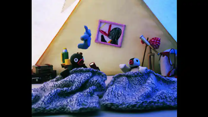 ピングーとピンガは物干し竿でテントを作り、夜を過ごすことになった。パパはマット、ママは食事を持って来てくれる。夜、テントの外に怪しい影が見え、物音もしたため、外に出てみる(「ピングーのキャンプ」)。