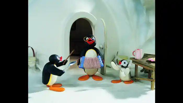 スプーンで物を叩き、遊んでいたピングーとピンガ。ママに怒られて外に出たふたりは、おじいさんの家へ向かう。おじいさんのアコーディオンに合わせて、3人はセッションを始めた(「ピングーの音楽隊」)。