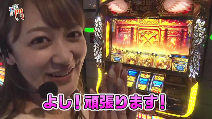 「ミリオンゴッド-神々の凱旋-」実戦するのは咲瑛子。勝負する機種はゴッド凱旋だ。前半、謎のV揃いを引き、その3セットを消化した状態からスタート。番組後半ではアルテミスの矢が何度も外れて…。