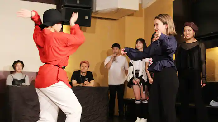 3連勝して賞金10万円を目指す3on3のダンスバトル。Gaunerの連勝を阻止するべく現れたのは、LOCK・POP・WAACKのチーム「女子力」。ボンバーヘッドとパーティのノリで、女子力の高いパフォーマンスを披露。