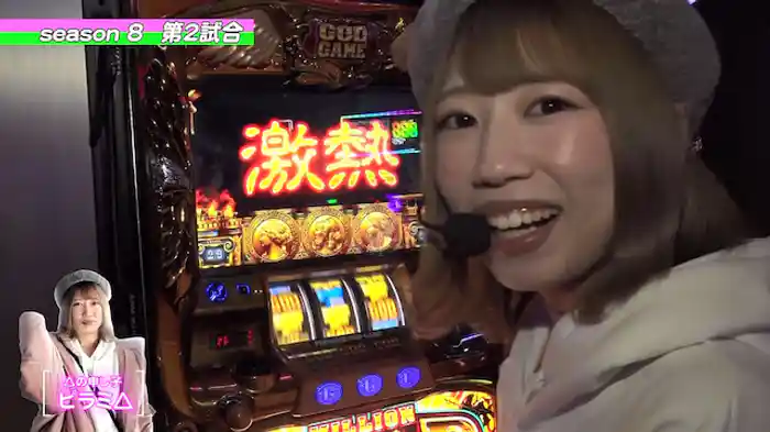 「ミリオンゴッド-神々の凱旋-」選抜メンバー6名の総当たり戦で繰り広げられるガチンコスロットバトル。今回はピラミ△対マコト。初戦でアドバンテージを得ようと考えたピラミは思い切って凱旋で勝負する。