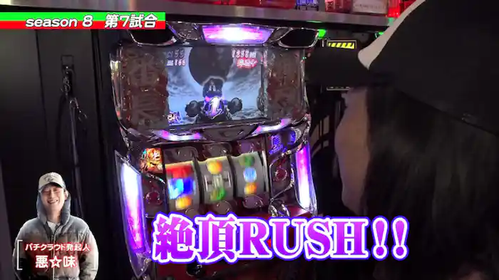「パチスロ北斗の拳 天昇」収録ホールは「アミューズ千葉店」。選ばれたメンバー6名による総当たり戦が行われる。シーズン8第3試合は、大和対悪☆味。朝一、大和はハナビ、悪☆味は北斗天昇から勝負する。