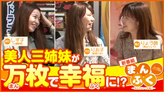大事なところで頼りになる長女のりょう姉・青山りょう、やる気十分な次女のしず子・七瀬静香、そして自由奔放な三女のりお子・東城りお。この3人が協力し合いながら、万枚達成を目指す。勝負する機種はゴッド凱旋、ハーデス、沖ドキ、北斗の拳天昇などだ。
