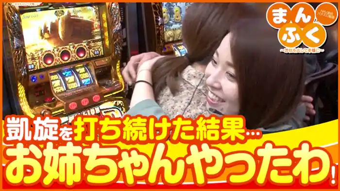 「ミリオンゴッド-神々の凱旋-」出玉担当といっても過言ではないりお子が段々と失速。ピンチに陥っていく。ところが、このピンチに凱旋を打つりょう姉がすぐさまV揃いから反撃開始。ここから彼女が大暴れする。