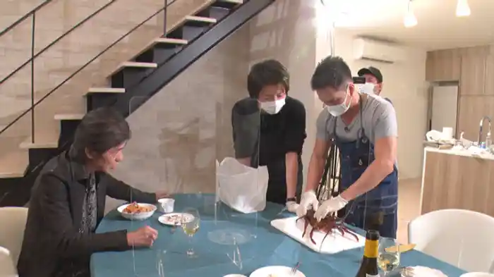 大先輩・佐藤浩市の登場に緊張しながらも、料理の仕上げにかかる市原隼人。フジタツは今がチャンスとばかりに佐藤に質問攻めをする。市原が用意したフルコースとうまい酒をたしなみつつ、俳優論を語りあう。