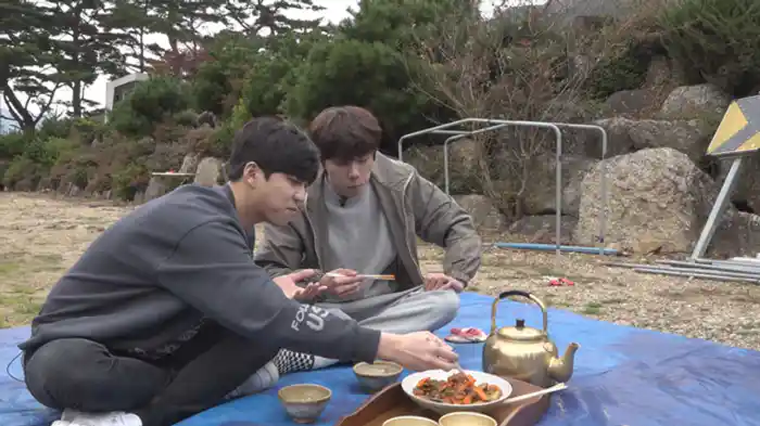 スヒョンとジュンは、陶芸教室のお礼に柵作りを手伝うことに。村長さんにやり方を教わるが、ついついふざけてしまう2人。労働の後にはドングリ寒天とマッコリを堪能し、さらにおいしいカキも食す。