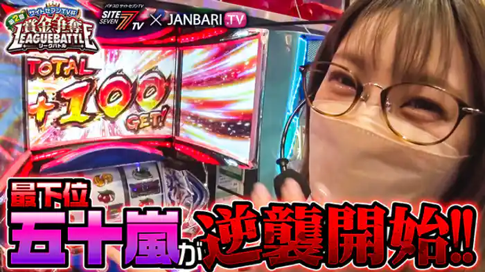 「パチスロ北斗の拳 宿命」収録ホールは「アビバ湘南台」。順調に出玉を伸ばしていく七瀬静香とリノ。一方、嵐と河原みのりはきれいな右肩下がりのグラフを描いて、早くも敗退の2文字が頭をよぎる。