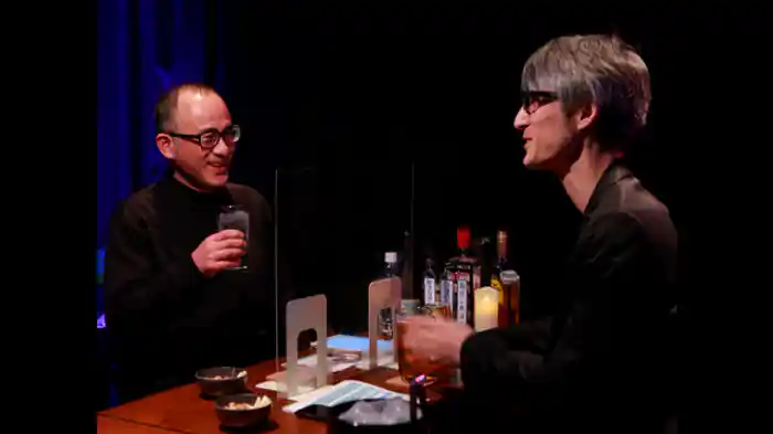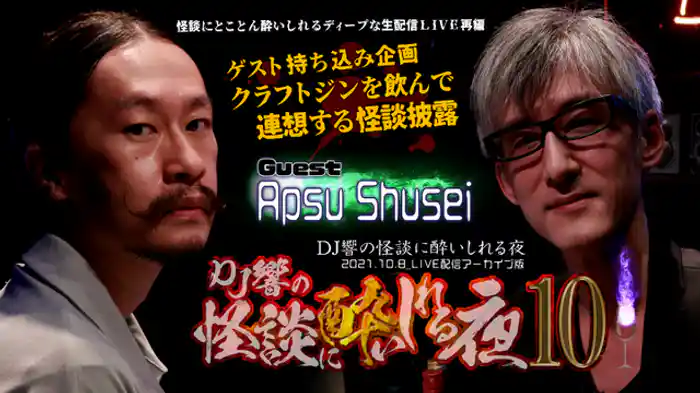 文様作家で、怪談愛好家のApsu Shuseiさんの持ち込み企画を敢行。お気に入りのクラフトジン5本を飲み比べて、そこからイメージした怪談を互いに披露するという、番組史上初の試みだ。Apsuさんが次々とお酒を作り...。