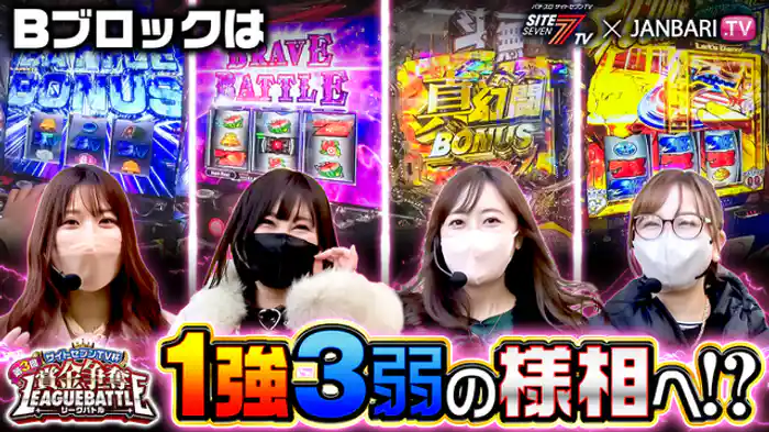 「パチスロ甲鉄城のカバネリ」収録ホールは「ガーデン北朝霞」。予選Bブロックの出場者は神谷玲子、七瀬静香、水瀬美香、そして白鳥みゆ。お金が大好きな4人が登場。それぞれが目的をもって死力を尽くす。