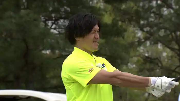 大畑大介対谷繁元信。今回はロングホールでドラコン対決。どちらが飛ぶのか注目が集まる。3度目の正直とばかりに「打倒上原」を掲げる大畑は、ここでも力が入る。