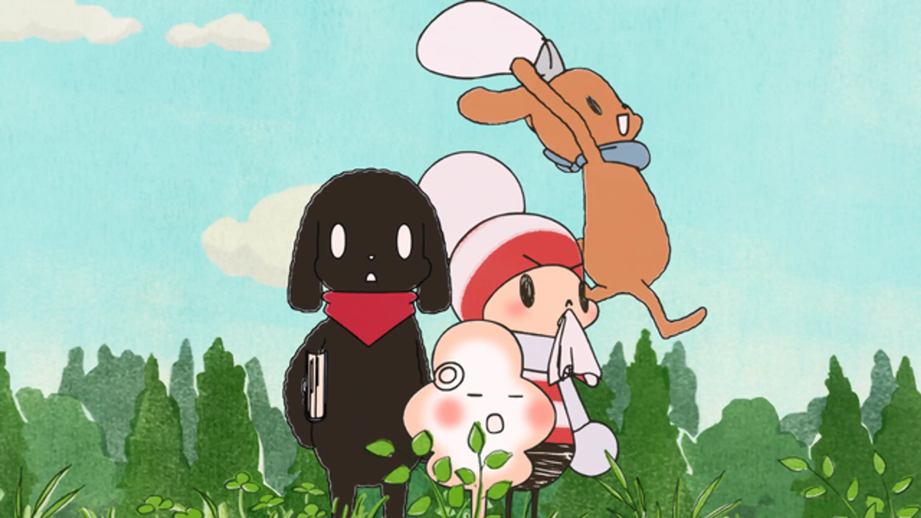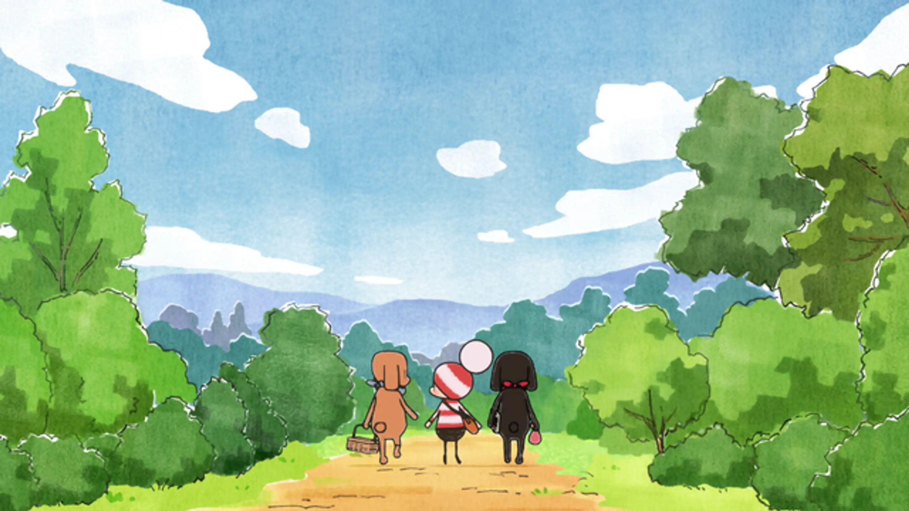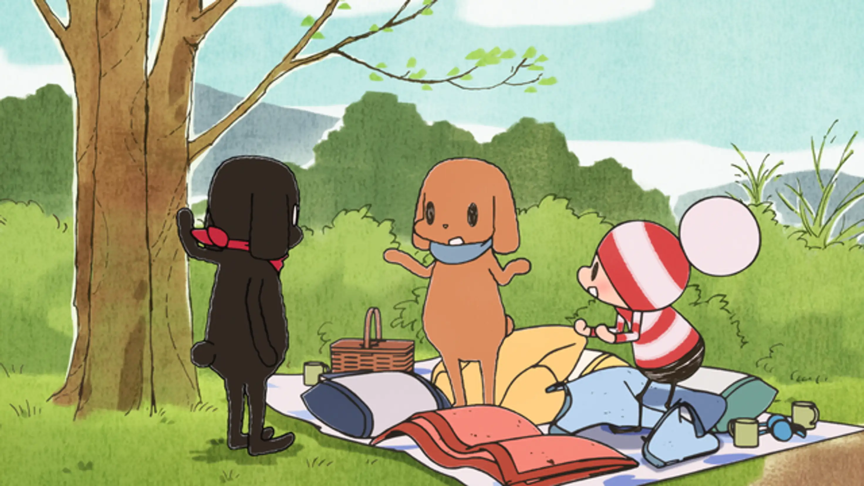 寝坊したオチビサンは、良い天気なのでどこか遠くへお散歩に行こうと考える。今からだと遅いかと思いつつも、急いで支度をしてお出かけするオチビサンのところに、ナゼニとパンくいがピクニックの誘いにやって来る。