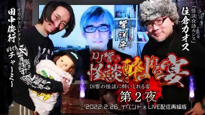 MCの響氏が新型コロナ感染により、自宅からリモート出演。ゲストは「怪談☆語ルシス」MC・住倉カオス氏とオカルトコレクター・田中俊行氏が人気の呪物人形・チャーミーと共に登場。観客からのお題は「連想怪談」だ。