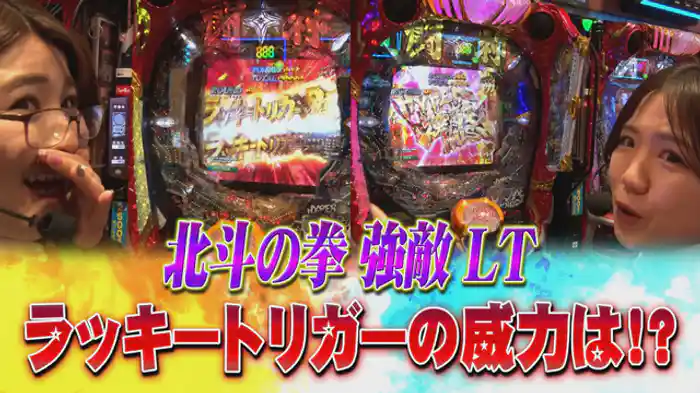「P北斗の拳 強敵 LT」ラッキートリガーの威力を体験しようと、北斗の拳強敵に挑む岡田ちほ、森本レオ子。苦しい戦いを覚悟していた2人だが、意外にも簡単に射止めてしまった。最高のスタートを切れそうだ。