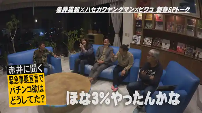 元プロボクサーで俳優の赤井英和は大のパチンコ好き。「ハセガワヤングマン」の大崎一万発、ヒロシ・ヤング、リスキー長谷川、そして真紀子ことビワコと一緒に楽しく実戦を行う。また、赤井宅で収録した新春スペシャルトークもお送りする。