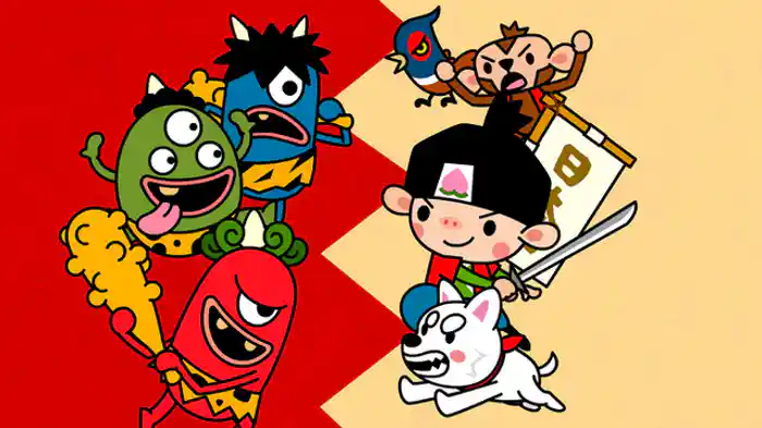 ももたろうが犬、猿、雉を仲間にし、きびだんごを分け与える。力を合わせた一行は、いざ鬼ヶ島へ出発。悪い鬼を退治するため、船を漕ぎ進める。