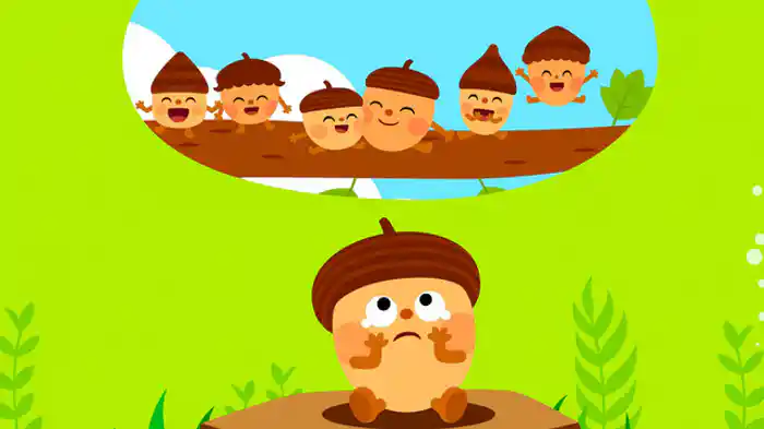 木の上で退屈していたどんぐりが、ある日、木から落ちて池に転がり落ちる。そこで出会った新しい友達と一緒に、楽しい時間を過ごす。