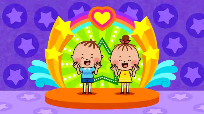 子供たちが人気の手遊び歌「あたまかたひざポン」に合わせて、元気いっぱいに体を動かす。カラフルな背景と楽しい音楽で、歌とダンスの楽しさを伝える映像。