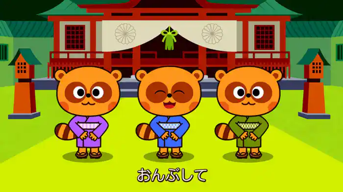 「げんこつやまのたぬきさん」の歌に合わせて、たぬきのキャラクターたちが楽しく歌い踊る。お祭りや神社を舞台に、可愛らしい動きと歌で童謡の世界を表現する。