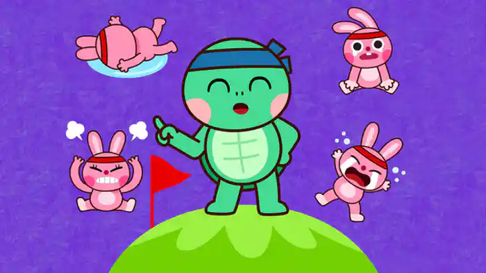 ウサギがカメの歩みの遅さをからかう。カメはこれに怒り、ウサギに競争を申し込む。二匹は山の麓を目指してかけっこを始める。
