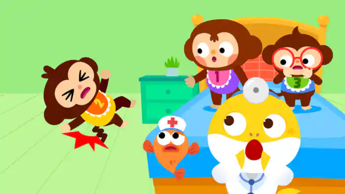 ベイビーシャーク病院に、ベッドでジャンプして怪我をしたサルたちがやってくる。医者のベイビーシャークと看護師のウィリアムが、レントゲンや点滴、薬を使って、サルたちの怪我を丁寧に治療する。