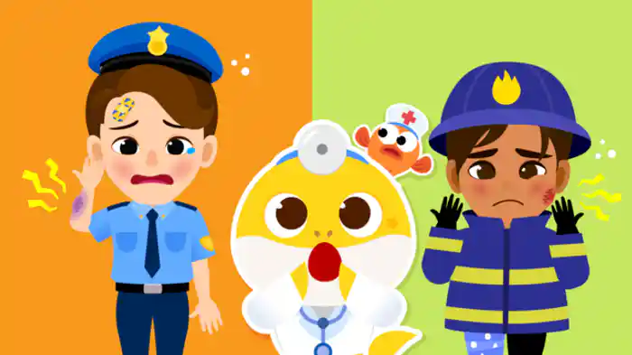 ベイビーシャーク病院に、怪我をしたおまわりさん、消防士さん、整備士さんがやってくる。ベイビーシャーク先生とウィリアム看護師が、それぞれの怪我を丁寧に診察し、治療する。