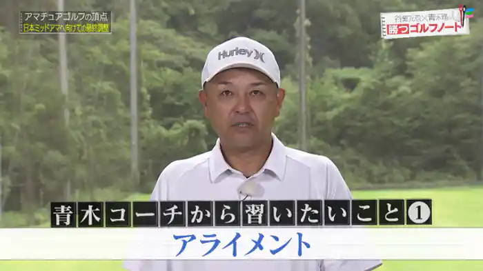 ゴルフの腕前は球界でも指折りといわれる谷繁元信が、「ミッドアマ」での全国制覇を目指すゴルフレッスンでさらにスキルアップ。今回はアライメントのおさらいだ。ターゲットに対してクラブと体の位置を調整する。