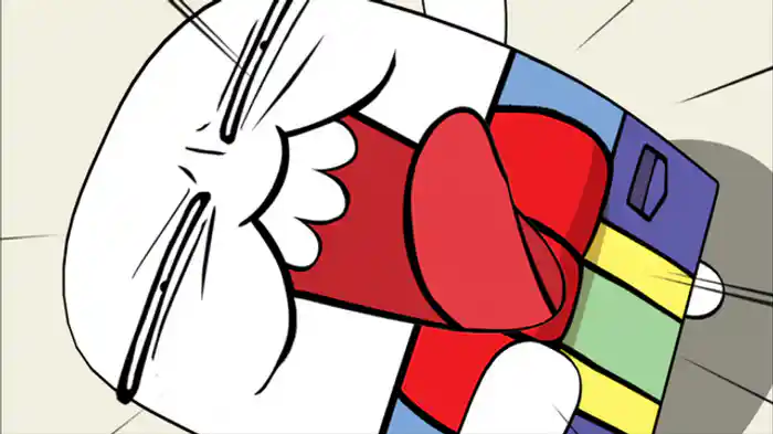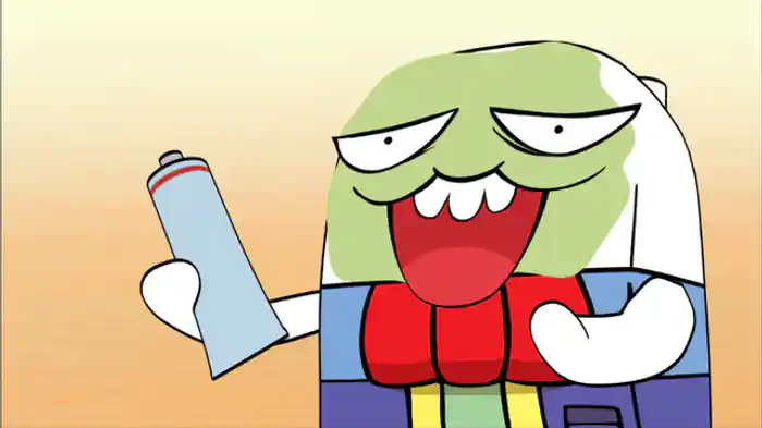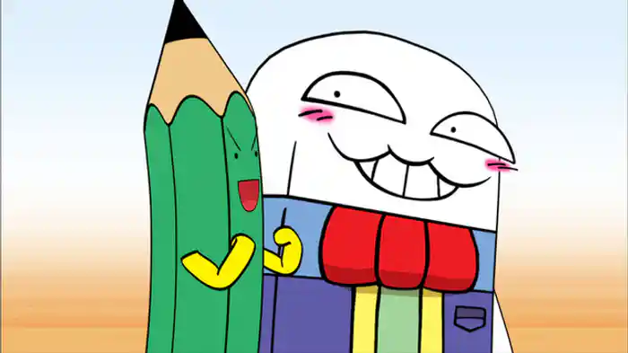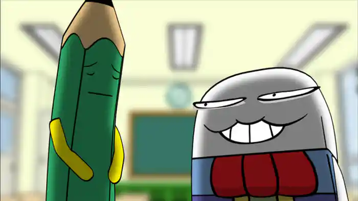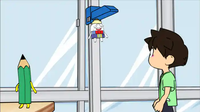 自称、文具界人気ナンバーワンのケシカスくん。「好きな文具=ケシカスくん」と書かれているのを何とか消させないようにするケシカスくんだったが...。(「オレ、ケシカス!」)