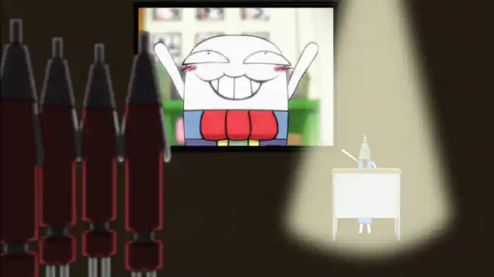机に落書きをするケシカスくん。消すために書いているのかと思いきや...。(「決死!ラクガキ地獄」)