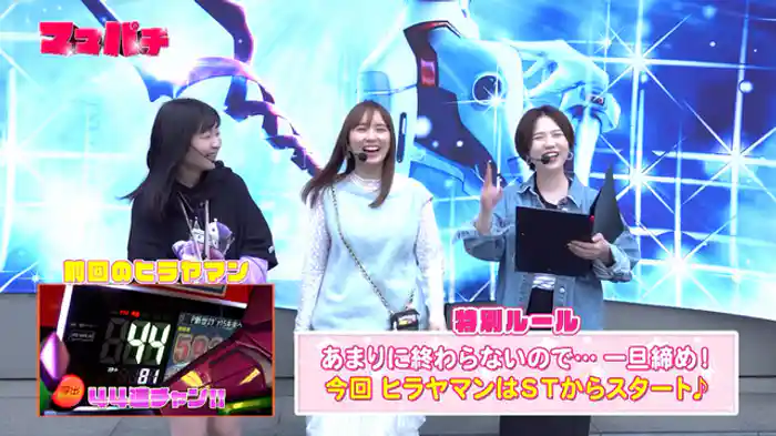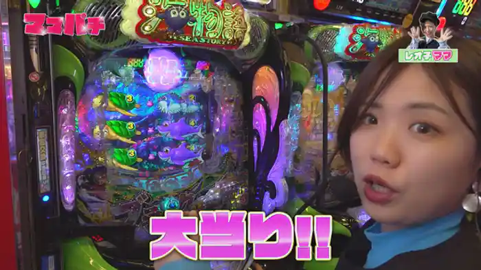 「Pスーパー海物語 IN 沖縄5」短時間でもパチンコを楽しもうという当番組。ナツ美、ヒラヤマン、森本レオ子は2連続で目標を達成している。今回はレオ子が禁書目録2、ナツ美がエヴァ咆哮、ヒラヤマンは鬼がかりだ。
