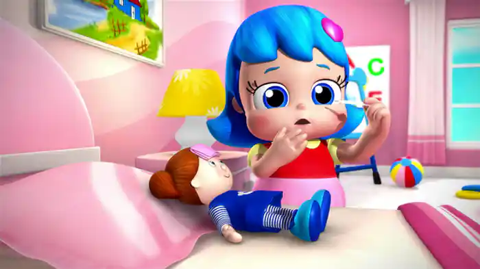 人形で遊んでいるキーとイーの友達は、人形に青い服を着せてあげる。