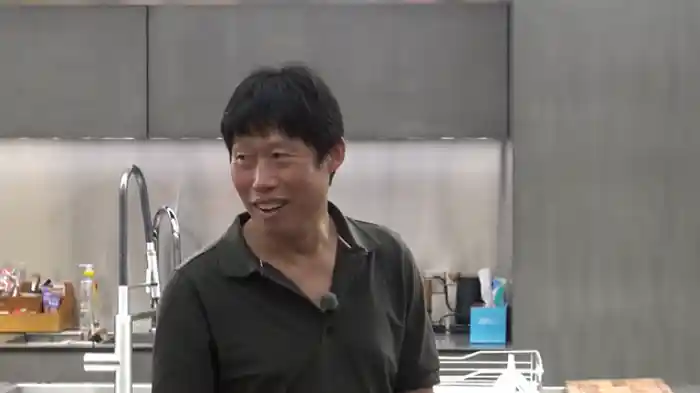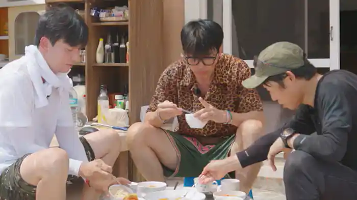 猛烈な暑さの中、船釣りから戻る3人。朝からりんごしか食べていない彼らは空腹を満たすため急いで昼食の準備に取りかかる。食事の後、腹ごなしに運動器具で体を動かすもいつしか真剣モードになり...。